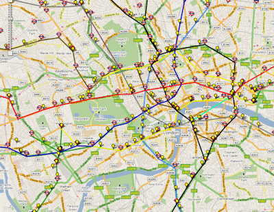 Live (real time train) departure data from the Transport for London API is overlaid on Google maps to produce a map showing the current location of London Underground trains. Once the map has initialised you can see all the trains moving around the network in real time.